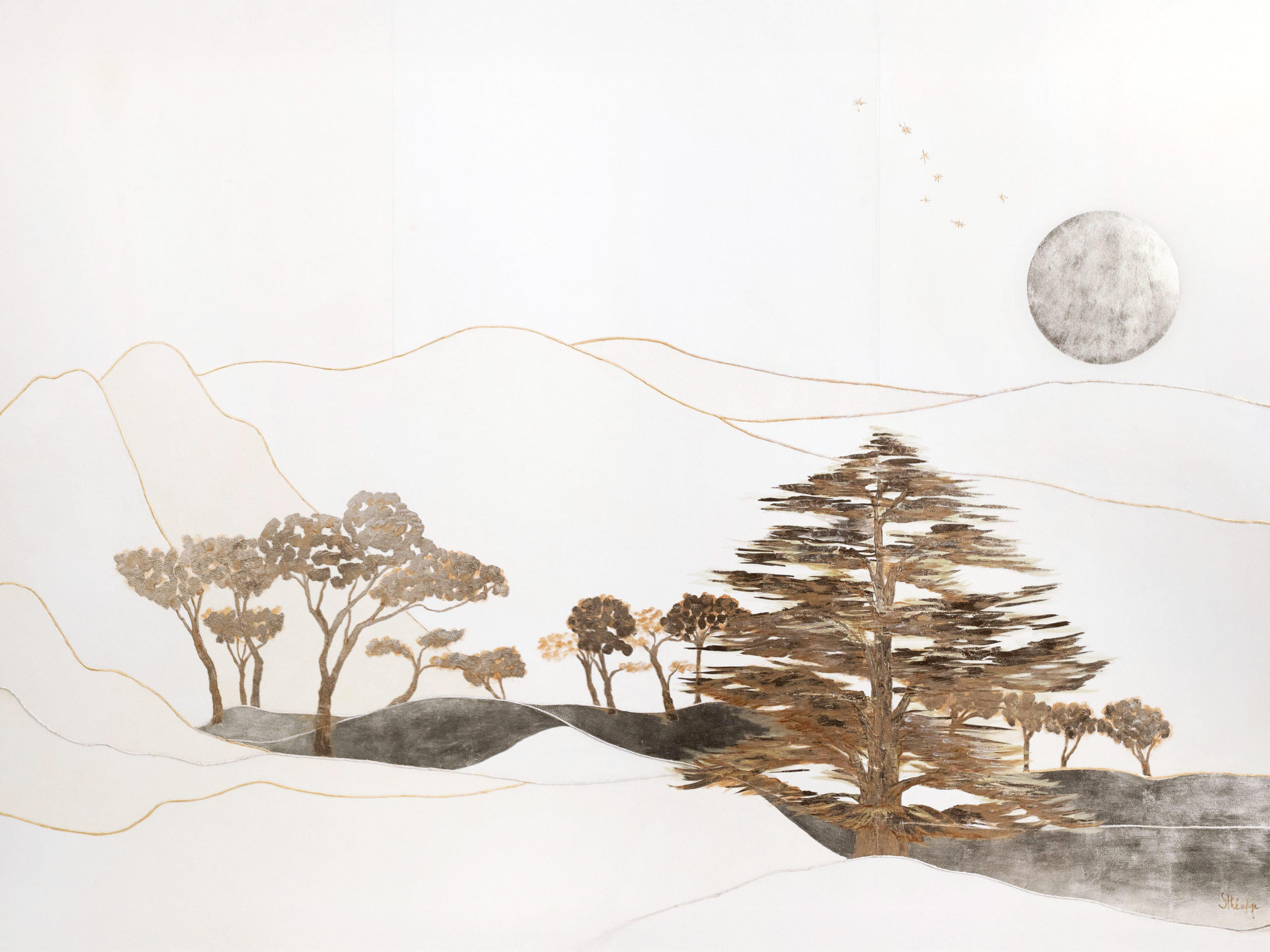 "The night is sweet", parchment marquetry, moon gold and white gold, golden linen. 150x92cm.