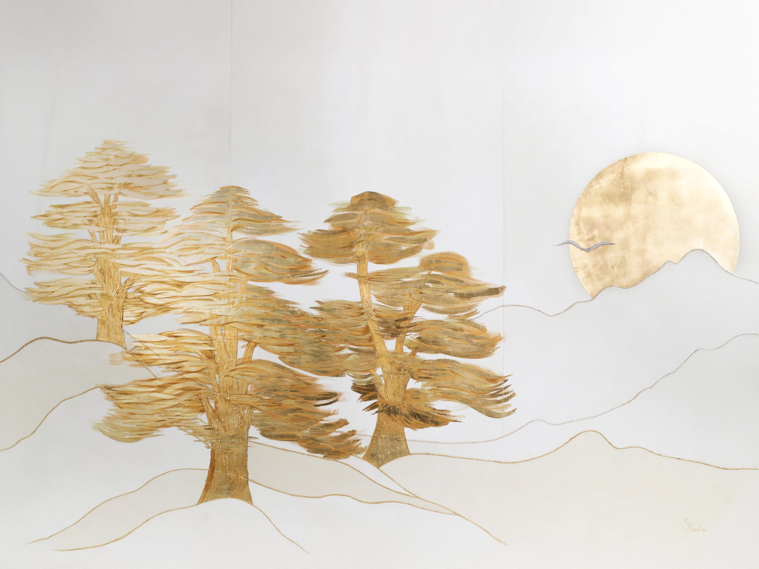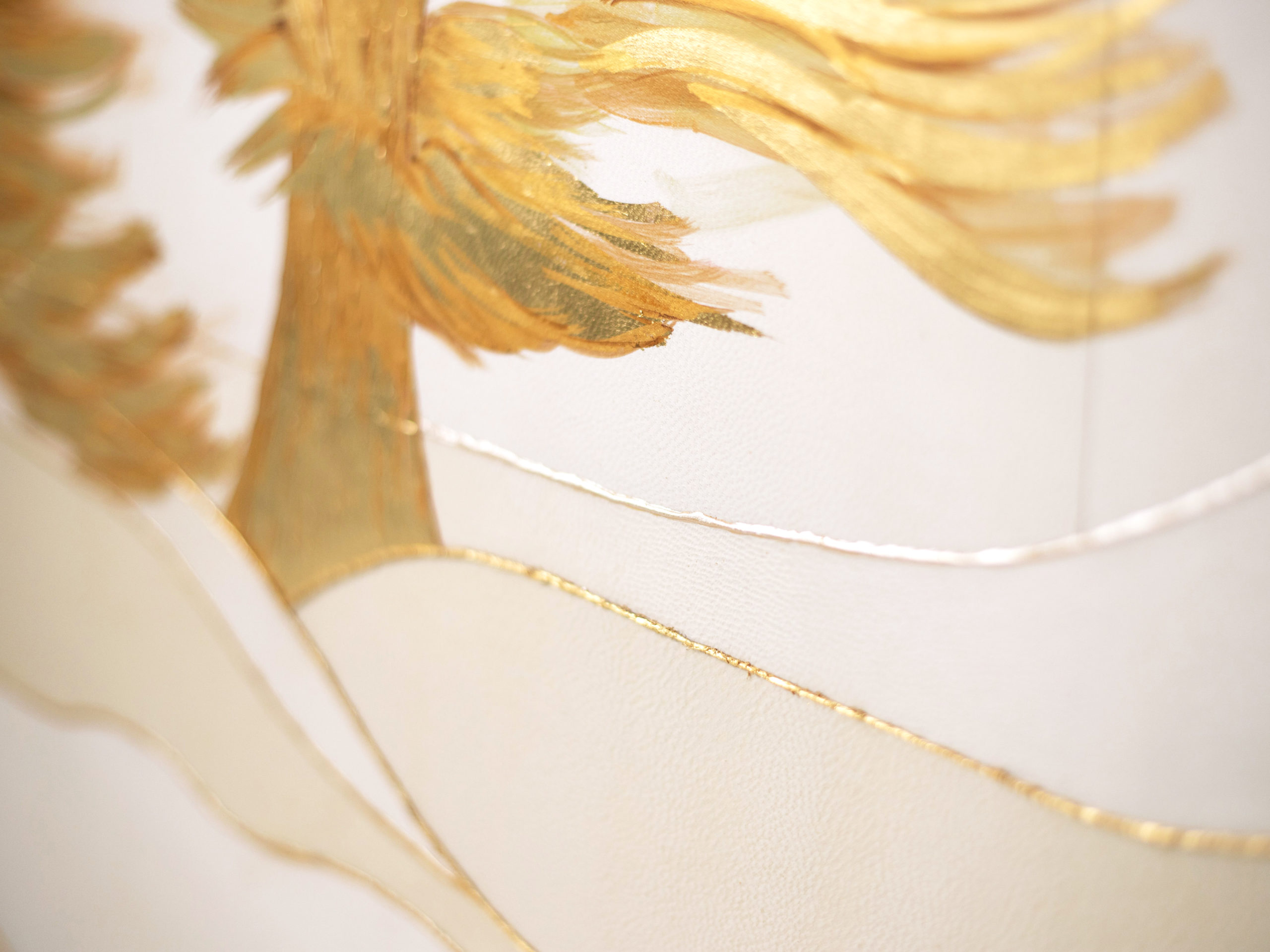 « Bonjour le jour », marqueterie de parchemin, or jaune et lin doré. 150x92cm.