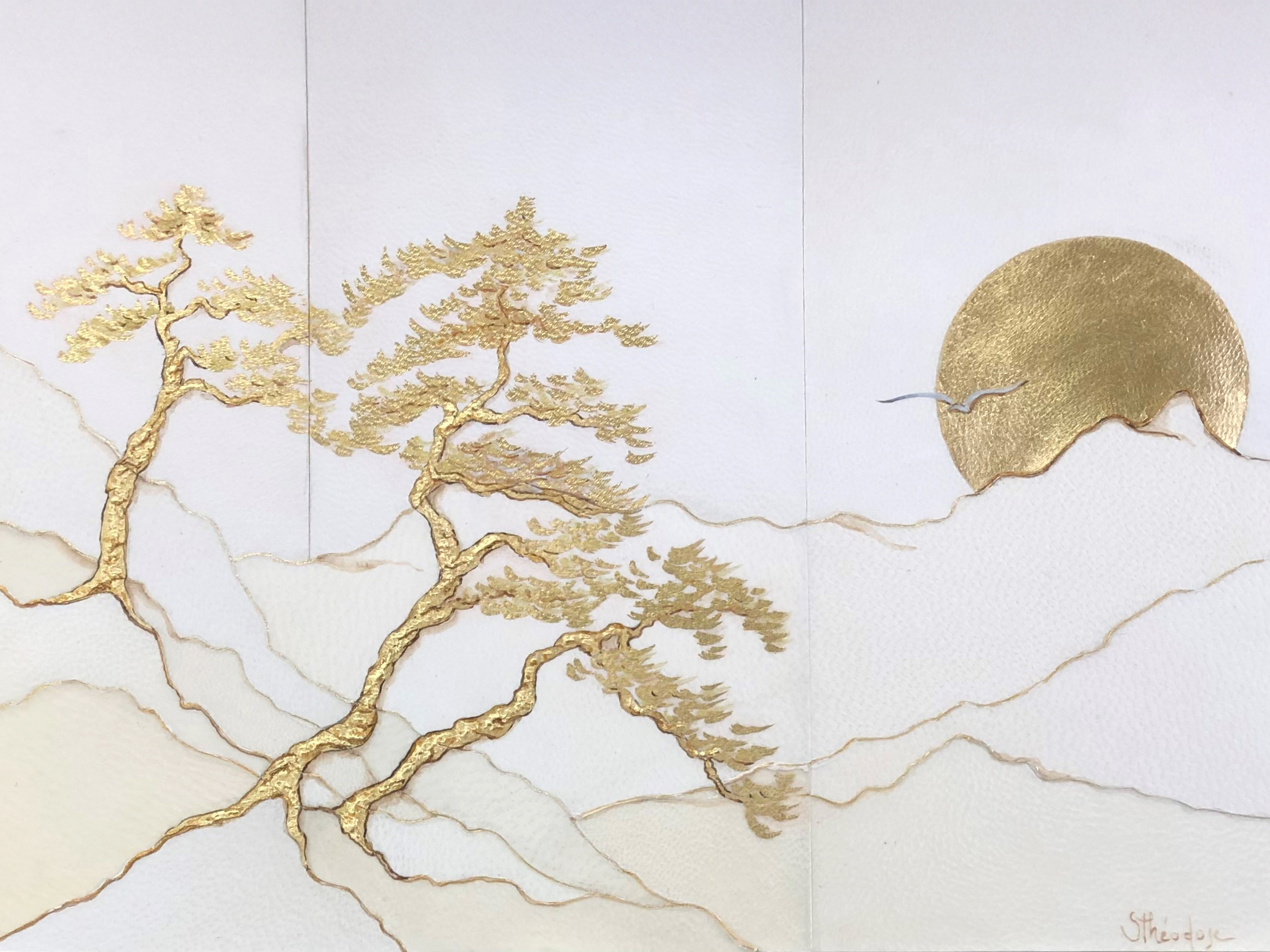 « La nuit est douce », marqueterie de parchemin, or moon et or blanc, lin doré 150x92cm.