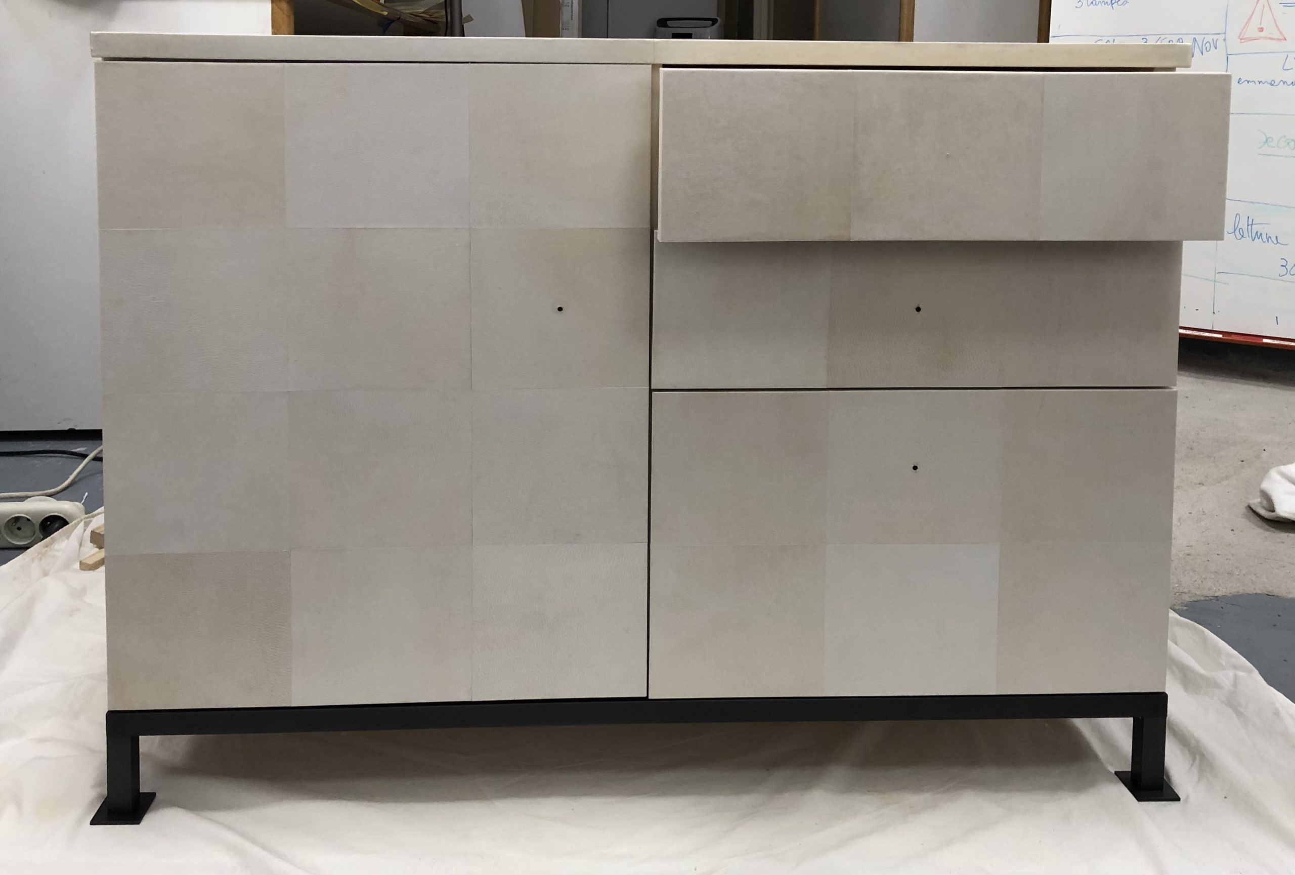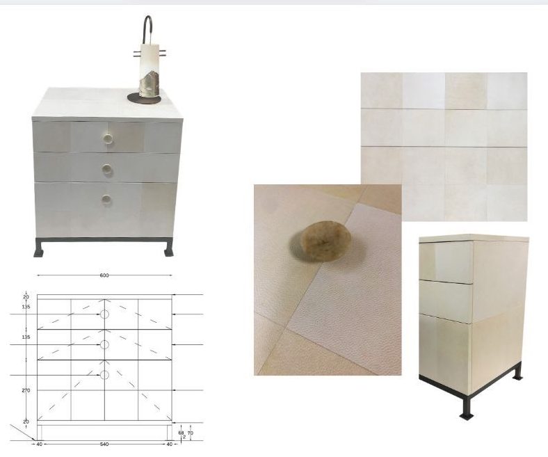 Goatskin parchment cladding for two bedside tables in collaboration with Maison RENNOTTE. Residential project 2025